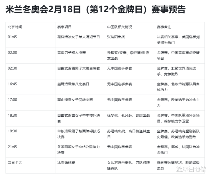 北京时刻2月18日,米兰冬奥会迎来第12个金牌日,全天将产生6枚金牌,赛事涵盖雪车、解放式滑雪、单板滑雪、峻岭滑雪等多个项目,看点纷呈。当日凌晨起,面貌溜冰、雪车等金牌赛率先开赛,午后至晚间,越野滑雪、峻岭滑雪及空中工夫、单板滑雪等重心赛事轮番献技。列国顶尖选手皆聚赛场,既有卫冕冠军的强势出击,也有重生代选手的全力解围,每一场金牌争夺战都充满悬念与看点。