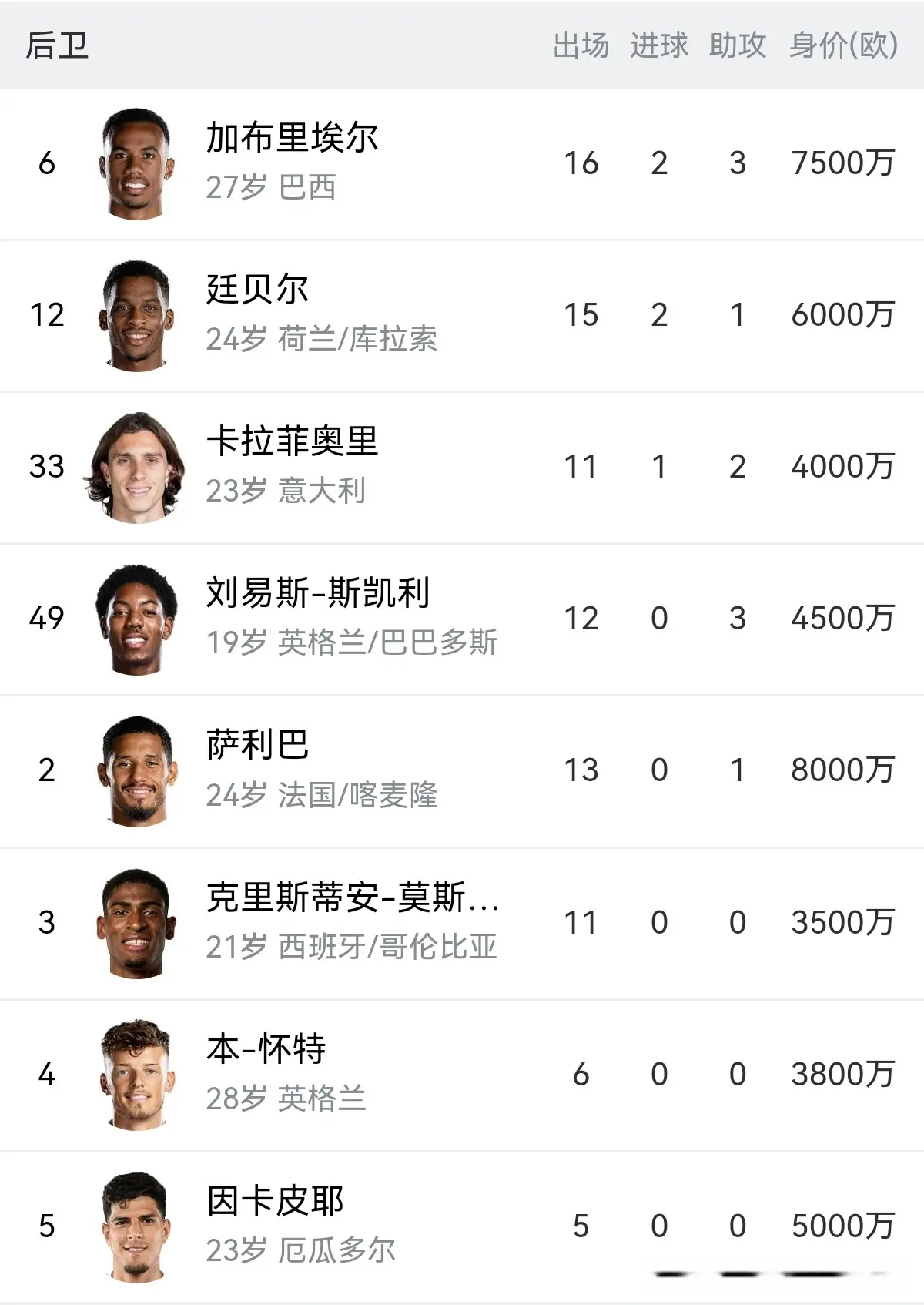 阿森纳的8名后卫身价总数达到了4.2亿欧元,身价最高的是萨利巴达到了8000万欧元,最少的是西班牙小将莫斯克拉3500万欧元。这条防地不仅实力浑厚,况且年纪结构罕见合理,最大的本-怀特也唯有28岁。