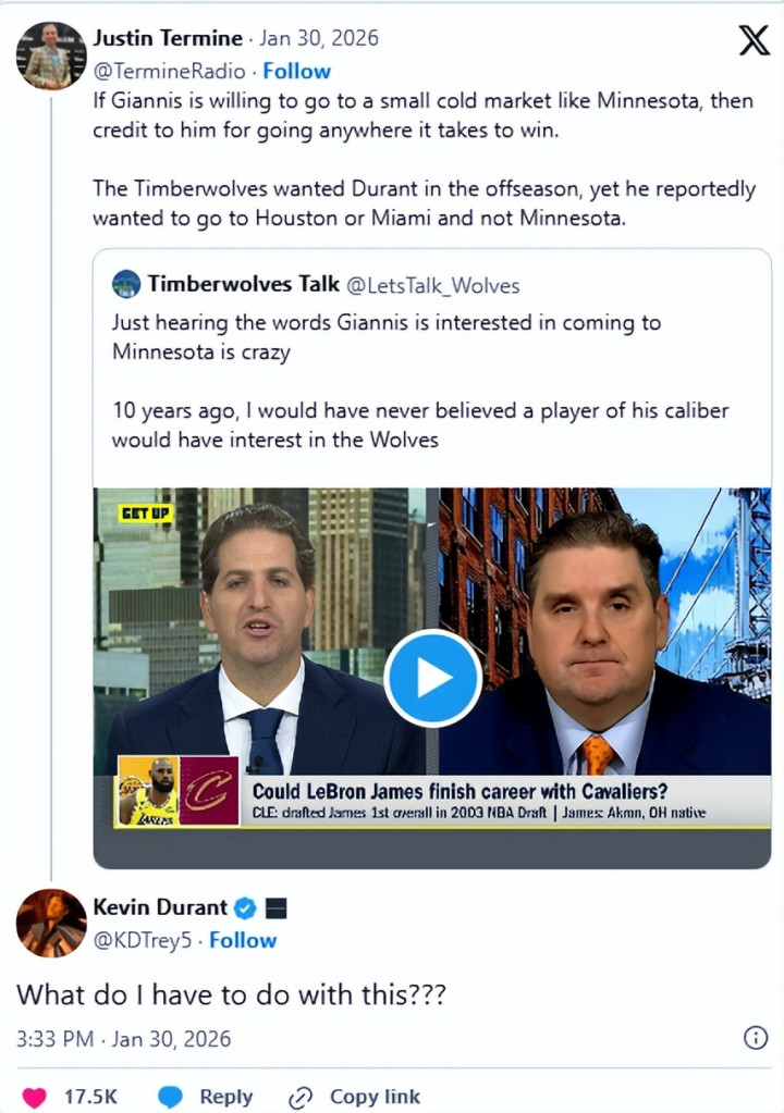 随后NBA记者Termine转发该帖子,并配文谈:“如果字母哥闲暇去明尼苏达这么的小球市,那他为了夺冠闲暇去任何方位的精神王人值得歌颂。丛林狼休赛期曾念念要杜兰特,但据说他只念念去休斯顿或迈阿密,而不是明尼苏达。”