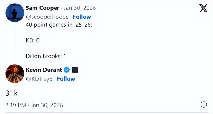 行为往复杜兰特的筹码之一,狄龙本赛季的发扬超过出色,近日单场轰下40分,创活命新高。有球迷指出,着力太阳队时刻,狄龙的40+得分场次是1场,比杜兰特(0场)还多,杜兰特则回复谈:“31K”,判辨所以我方活命累计31736分的配置给予回复。