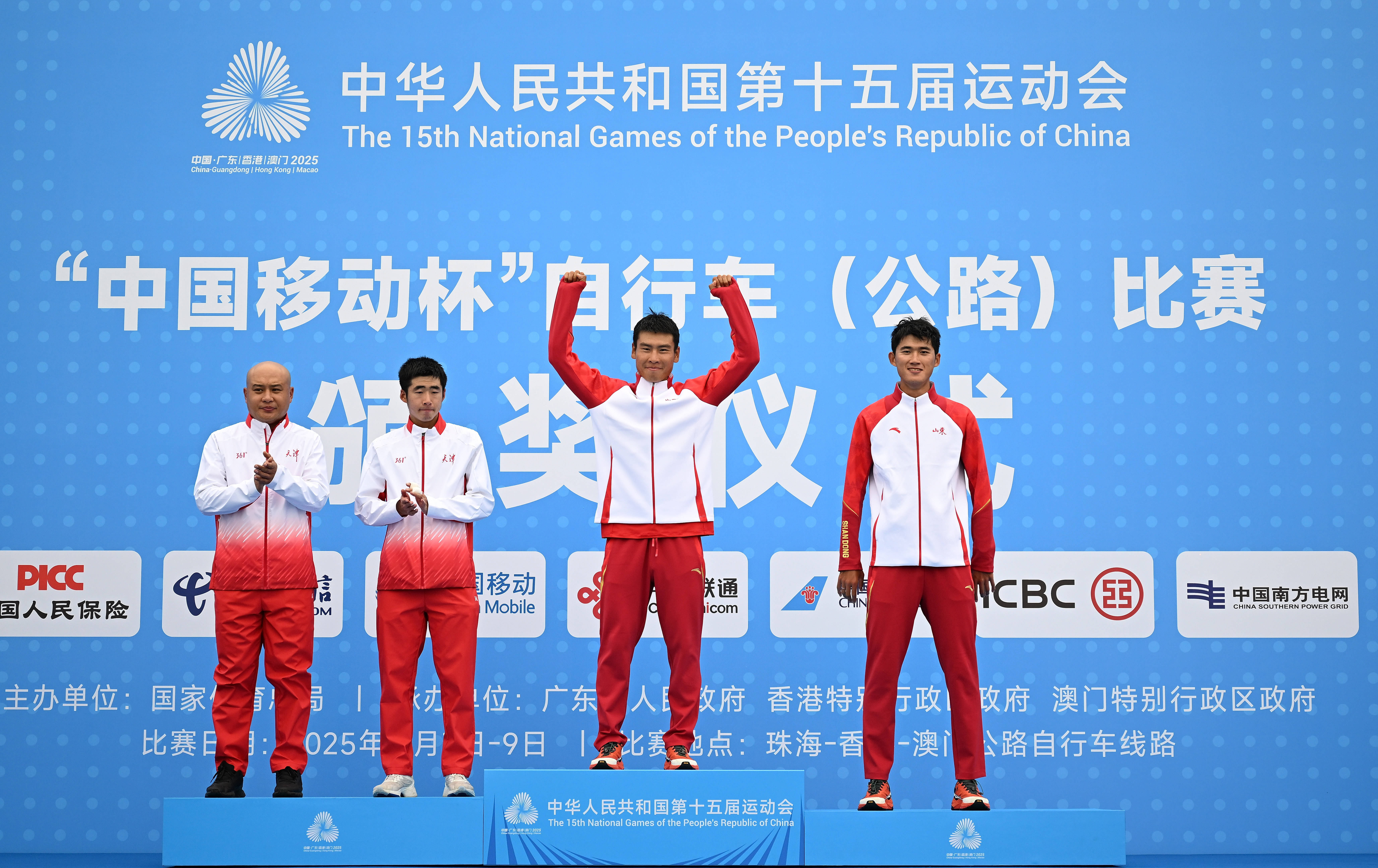 11月7日,冠军山东队选手苗城硕(右二)、亚军天津队选手薛铭(左二)、季军山东队选手曹厚旺(右一)在受奖典礼上。当日,第十五届宇宙融会会公路自行车男人个东说念主计时赛决赛在珠海举行。新华社记者 邓华 摄他左手食指和中指齐缠着厚厚的纱布,两根手指根部间的血印依然鲜红。