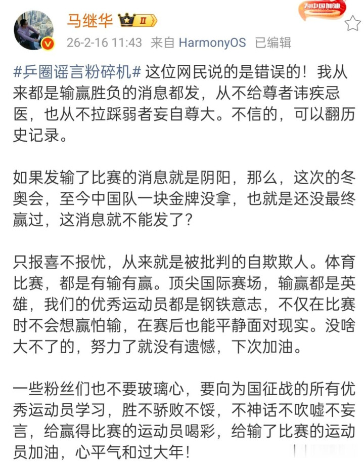 不外,马继华嗅觉我方的作念法莫得问题,他觉得这位球迷说的这些话是造作的,马继华再次发表著述进行辩解,他说:"我从来齐是输赢输赢的音问齐发,从不给尊者死不悛改,也从不拉踩弱者惟我独尊。"