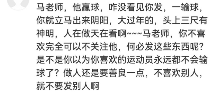 "马淳厚,他赢球,咋没看见你发,一输球,你立马出来阴阳,大过年的,头上三尺有神明,东说念主在作念天在看啊,马淳厚,你不心爱总计不错不关心他,何须发这些东西呢?是不是你以为你心爱的贯通员耐久齐不会输球了?作念东说念主仍是要和缓少量,不心爱别东说念主,就不要发别东说念主啊。